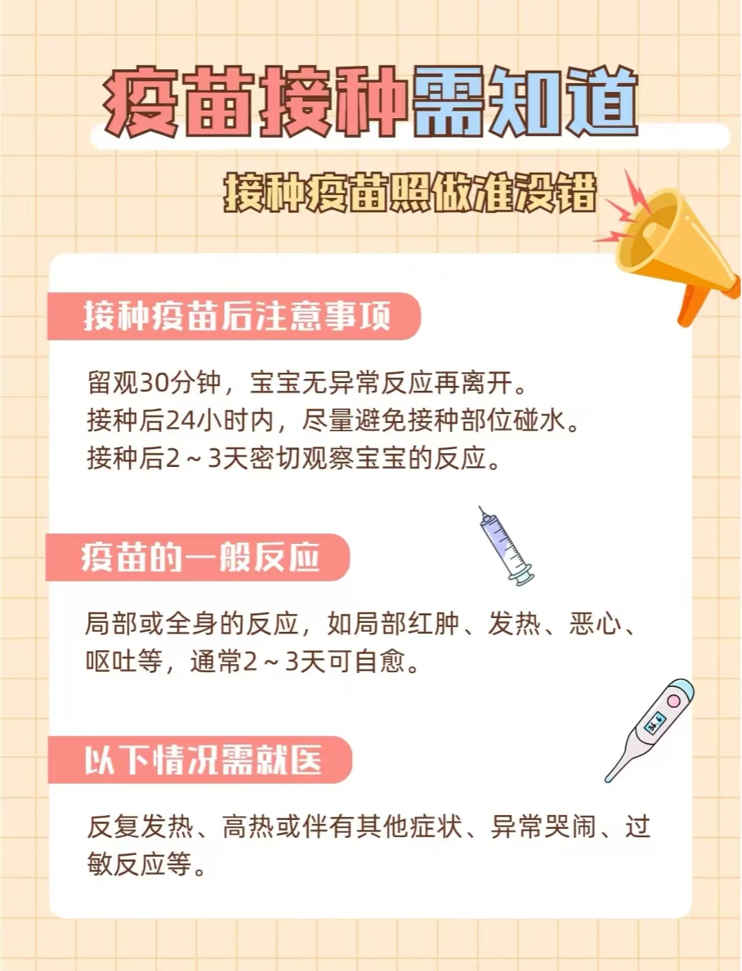 - 注意观察宝宝的反应,可能会出现轻微发热、局部红肿等,一般无需特殊处理,2-3天会自行消退。如果反应严重或持续时间较长,要及时就医。
