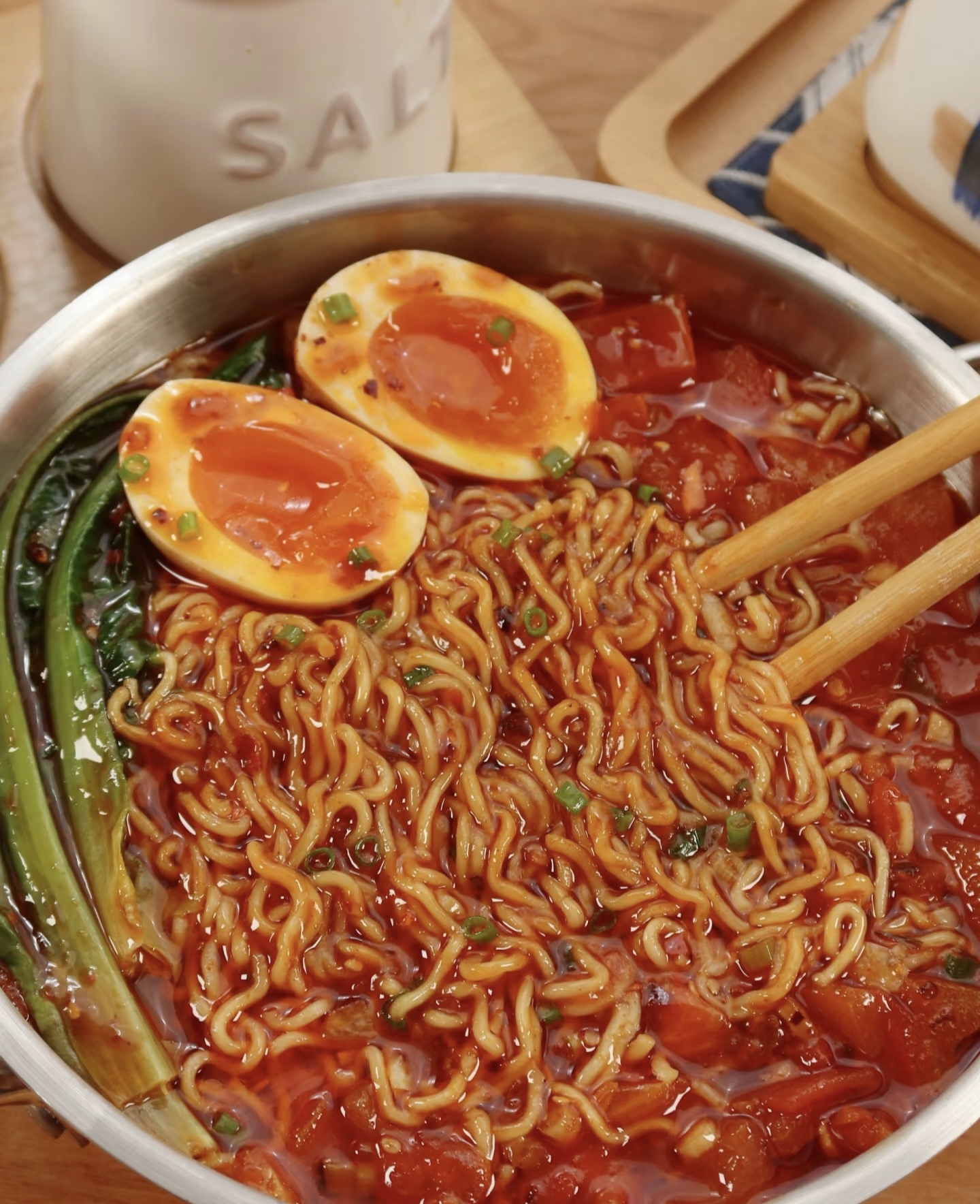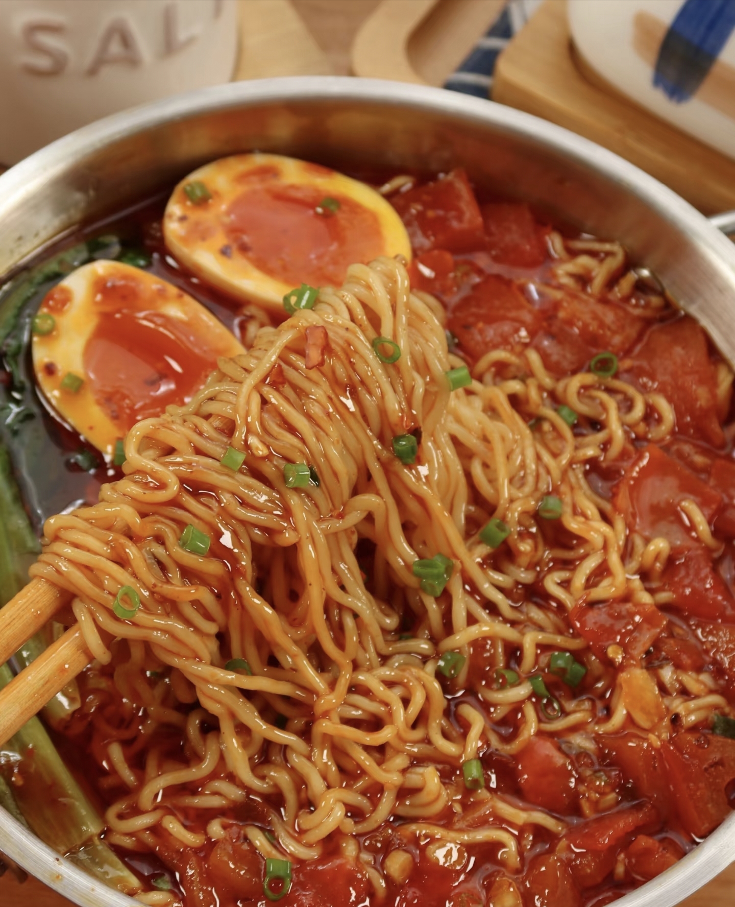 一碗端上桌,红亮的汤汁浓稠适度,每一根面条都裹满了番茄的精华,酸中带甜,咸鲜适口。喝一口汤,那股浓郁的番茄香气瞬间充满口腔,暖意从胃里一直蔓延到四肢。简简单单,却比任何复杂的菜肴都来得踏实。