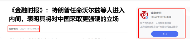 3.原文登载于观察者网2024年11月13日关于“《金融时报》:特朗普任命沃尔兹等人进入内阁,表明其将对中国采取更强硬的立场”的报道