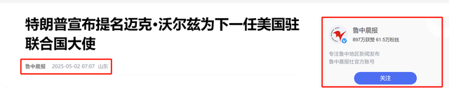 2.原文登载于鲁中晨报2025年05月02日关于“特朗普宣布提名迈克·沃尔兹为下一任美国驻联合国大使”的报道