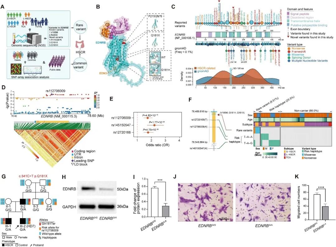对一个携带p.Gln181Ter杂合变异的HSCR家系(HD7)进行的研究显示,该变异与疾病表型完全共分离(图1G)。研究团队利用基因编辑技术在人多能干细胞中模拟该基因型,并分化为肠神经嵴细胞(ENCC)进行功能实验。结果显示,p.Gln181Ter变异导致EDNRB在mRNA和蛋白水平的表达降低(图1H、I),并显著损害了ENCC的迁移能力(图1J、K),证明了该变异通过功能缺失机制参与HSCR发病。