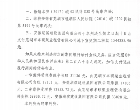 2022年,芜湖市中级人民法院作出民事裁定,认为原判决确有错误并启动再审。再审案件最终判决撤销原二审判决,维持一审判决的部分内容,并判令湖某公司支付丰某架业地下室延期工程款1544288.90元。再审法院认为,合同约定的90天工期针对整体地下室还是单个区域双方理解不同,结合实际工期398天的情况,对超出90天的期限对折计算延期工程款。但最终仍未依法按照双方签订的合同约定条款全额支持企业诉求。