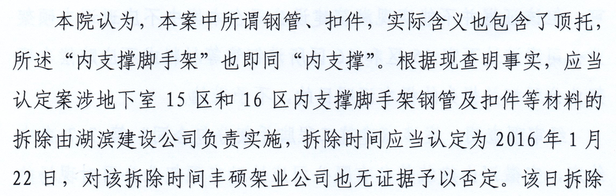 地下室15、16区相关纠纷中,在2017年原一、二审法院已查明并判决地下室15、16区完工,但内支撑钢管及扣件未拆除,但在2021年中院二审判决中,法官引用与案件无关的检测报告认定材料已拆除,直接否定先前法院查明认定的事实,免除湖某公司延期工程款支付义务。同时,法院认可该区域5805.06平方米工程款归属丰某架业,却否认其中2000余平方米对应的施工材料所有权。对于湖某公司占材料不予返还的行为,竟以“材料丢失”为由判决双方各承担一半责任,无视公安出警记录证明企业因湖某公司阻拦无法运走材料的事实。