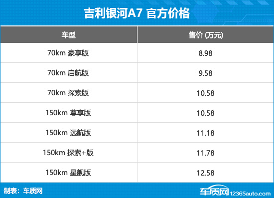 8月8日,吉利银河A7正式上市,新车共推出7款车型,售价区间为8.98-12.58万元,限时先享价8.18-11.78万元。同时,官方还推出“重磅礼”、“升舱礼”、“金融礼”等多重购车权益。吉利银河A7定位为中型车,将全面对标比亚迪秦L DM-i。