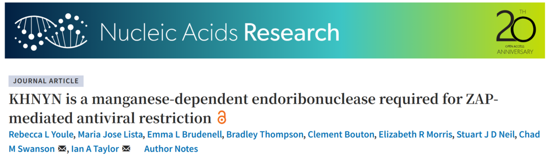 研究以“KHNYN is a manganese-dependent endoribonuclease required for ZAP-mediated antiviral restriction”为题发表在《Nucleic Acids Research》上。