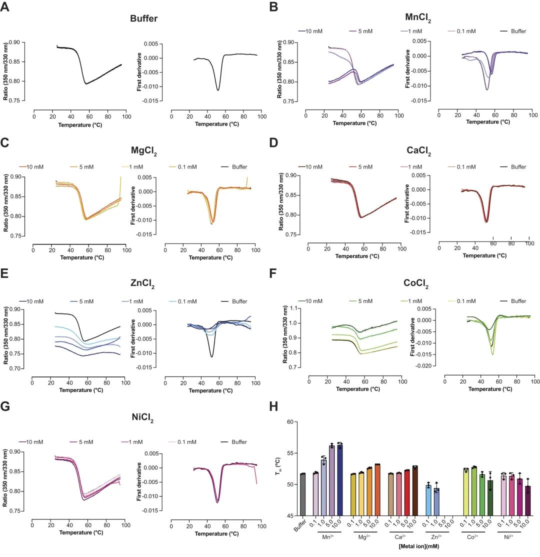 NanoDSF分析显示,Mn²⁺能显著提高蛋白熔化温度(Tm),而Zn²⁺等则导致不稳定。