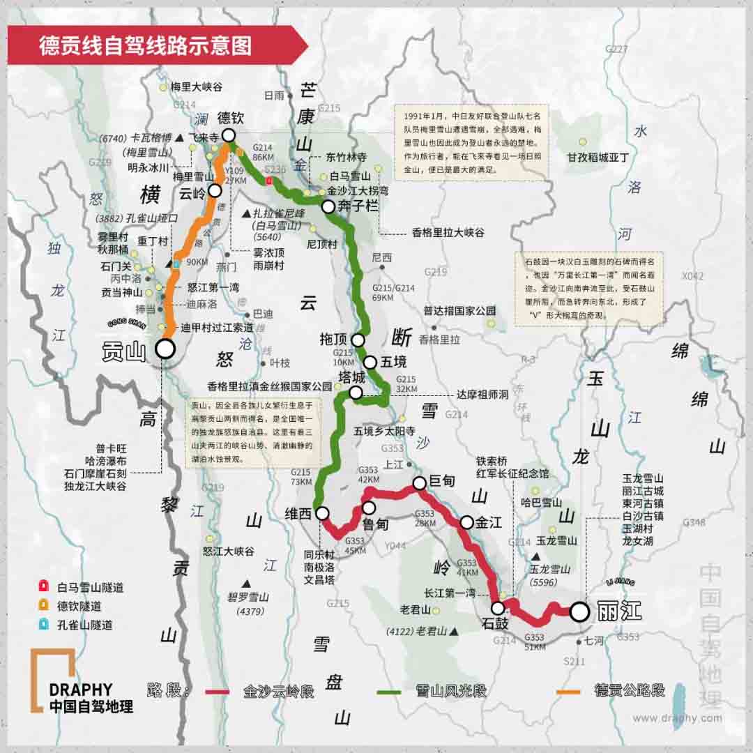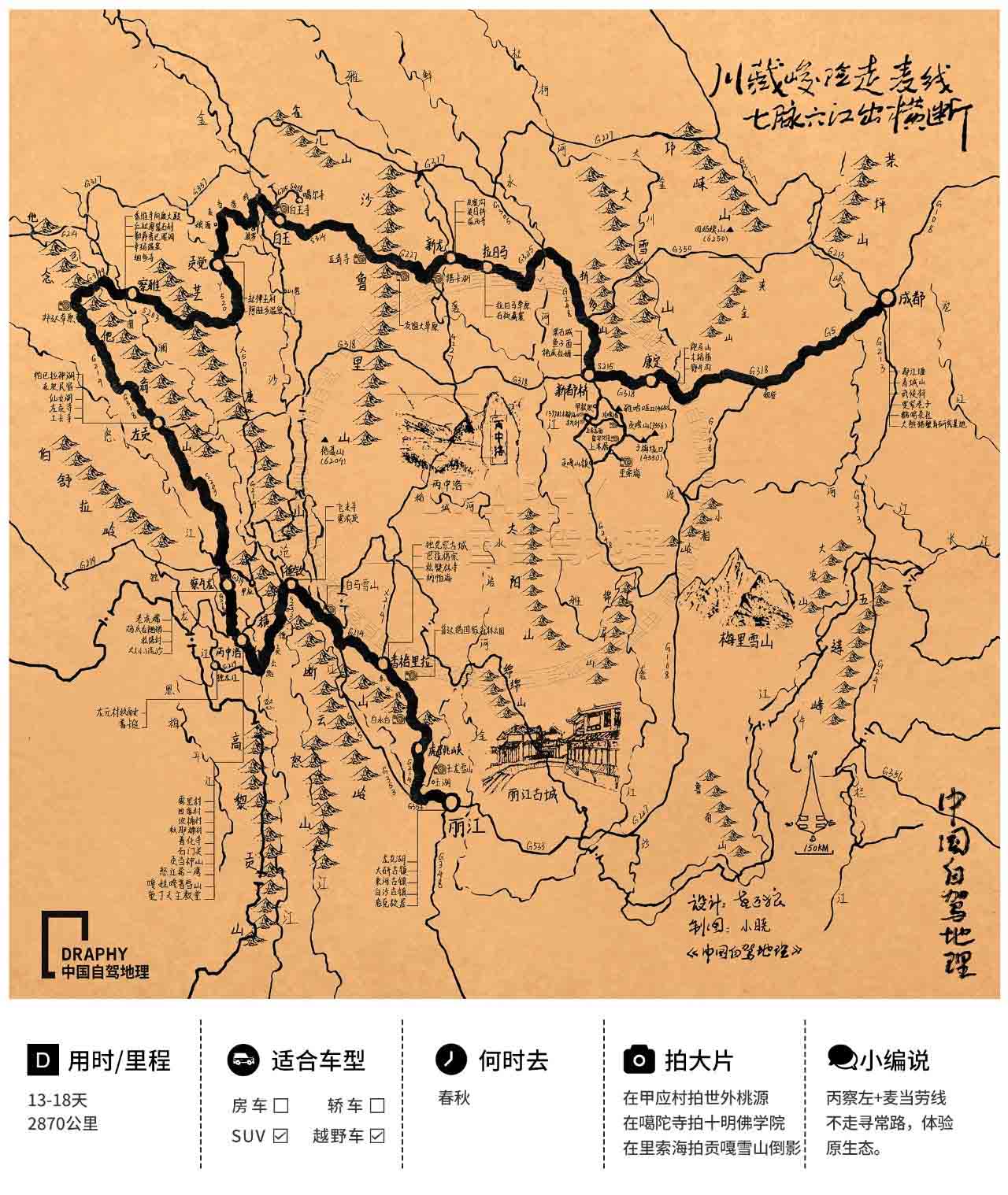 今天这条自驾线,就带你从浪漫丽江出发,驶上横断腹地的德贡公路、丙察左,文化底蕴深厚的麦当劳线,一路跨越金沙江、澜沧江、怒江、雅砻江、鲜水河、大渡河、岷江,抵达成都。