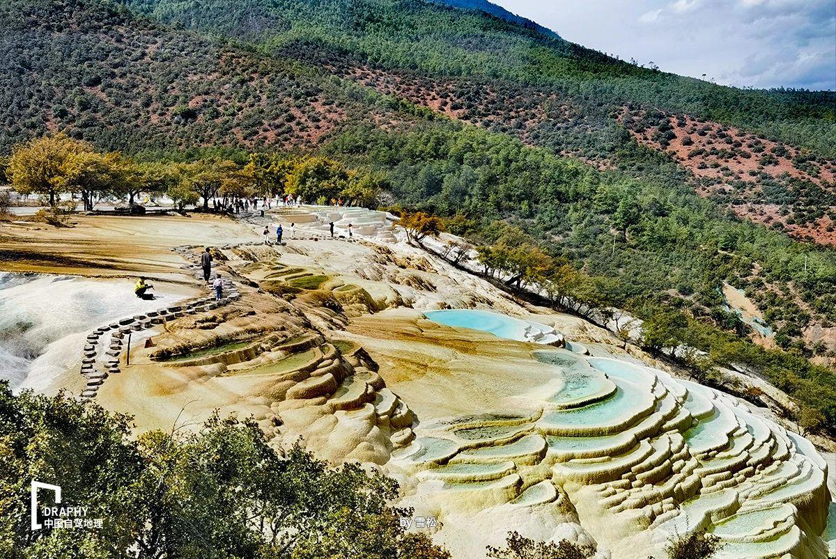 往北12公里的玉龙西泉华滩(海拔4100米),如人间瑶池般镶嵌在贡嘎西麓。自上而下有八个泉华滩阶地缓缓铺开,清澈斑斓,让人惊叹。