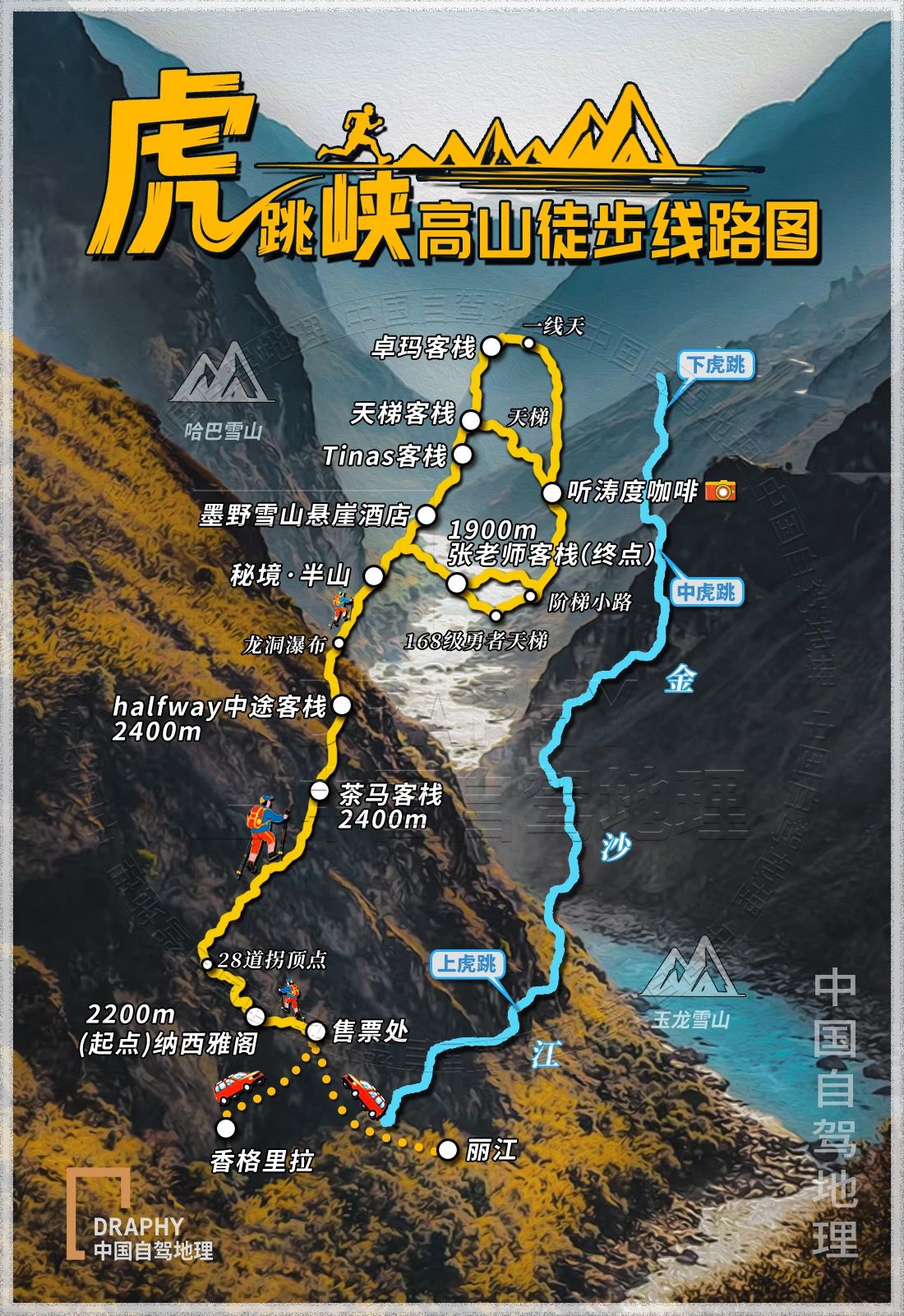 虎跳峡分为上虎跳、中虎跳、下虎跳三段,上虎跳是旅游景区,中虎跳和下虎跳都是国内外徒步爱好者的天堂,但请注意谨慎选择徒步路线,不要前往未开发、未开放的区域。