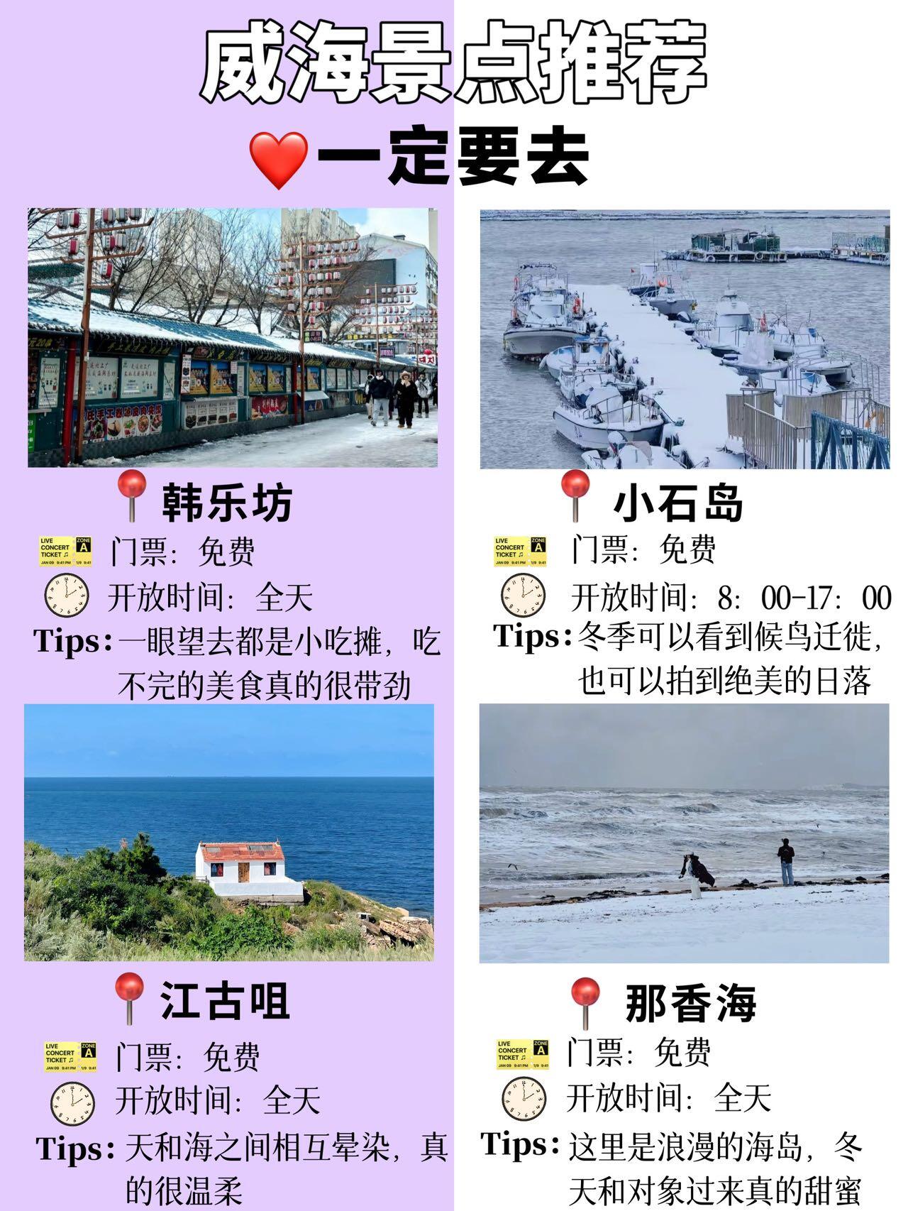 📍猫头山(山形似猫,很具有特色)→📍金海滩(下雪的时候更美,很有意境)→📍刘公岛(这里可以看到海鸥,很多人来这里拍照打卡)→📍那香海(有雪景衬托真的绝美!!一定不要错过)