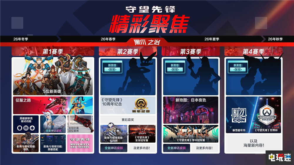 暴雪在2026年为《守望先锋》所做出的规划可以说内容不少。新的“黑爪之治”主线剧情,该内容包含一条横跨一年6个赛季的故事线,剧情将通过动画电影、动态漫画、游戏活动、语音内容、短篇小说等多种形式推进,同时游戏中地图、美术与玩法也会随故事发展发生变化。