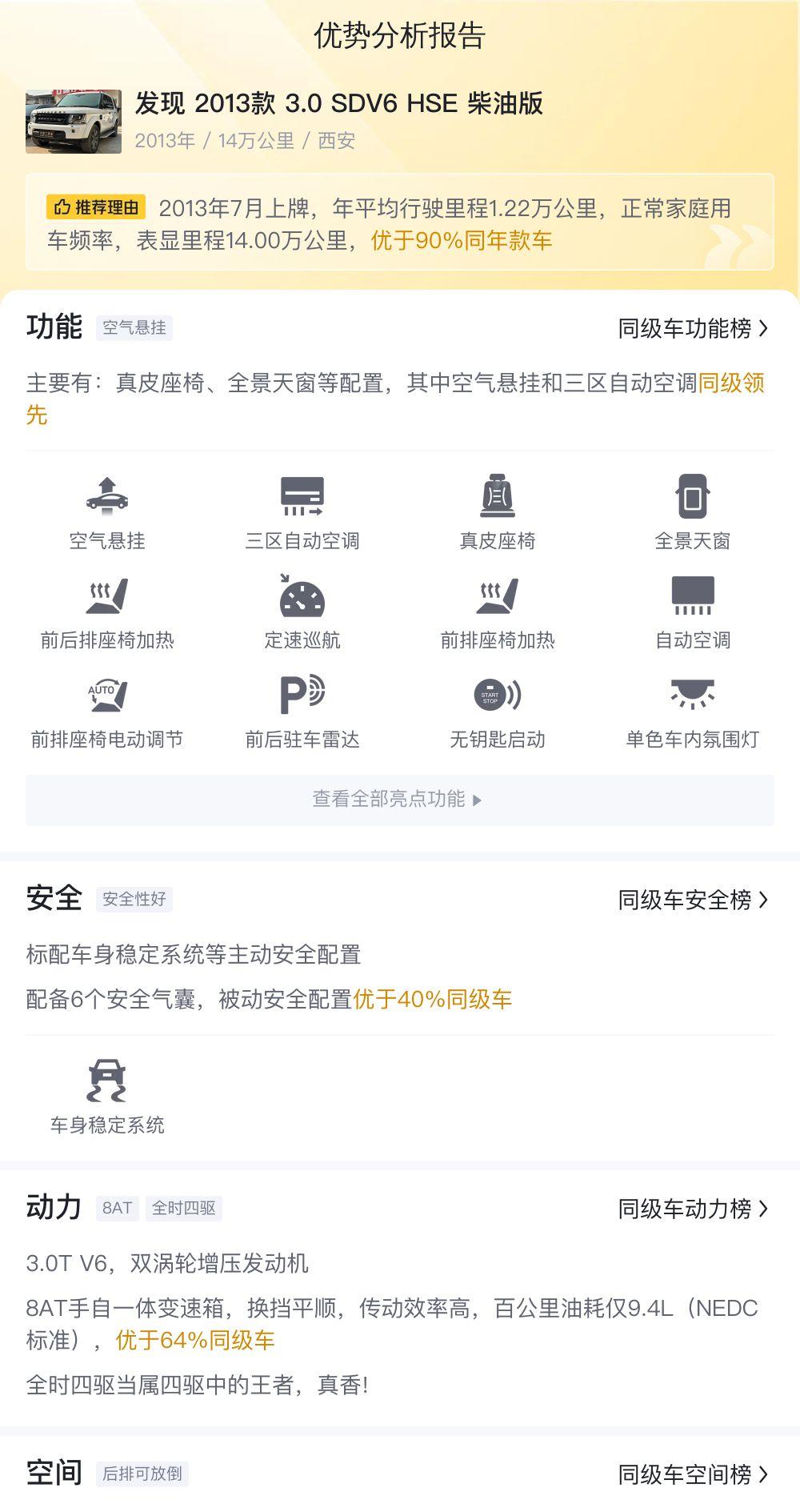 最后,我们再来回顾一下这辆车的基本信息:2013款路虎发现3.0 SDV6 HSE 柴油版,上牌日期2013年7月,表显里程14万公里,5次过户记录,车源所在地和牌照所在地均为西安,车身颜色白色,内饰颜色浅色,排放标准国IV,能源类型柴油,新车指导价84.8万元,二手车报价20.8万元。