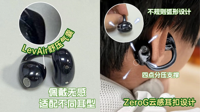 南卡ClipSuper2在结构上做了全面升级,固定部分搭载LevAir零压气囊,可以根据佩戴压力自动调节,形成缓冲效果,长时间佩戴耳朵也没有压迫感。整机仅4.8g,轻盈到几乎无感。搭配ZeroG云感耳扣结构,通过多点支撑实现稳固与舒适的平衡,剧烈运动也不易脱落。连接部位使用航空钛合金和高分子记忆材料,韧性与强度兼备,反复弯折万余次也不变形,耐用性拉满。