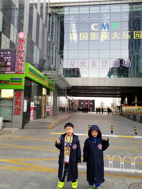 海南双胞胎小演员在北京星光影视园大楼前留影