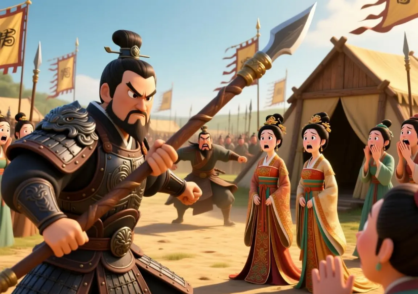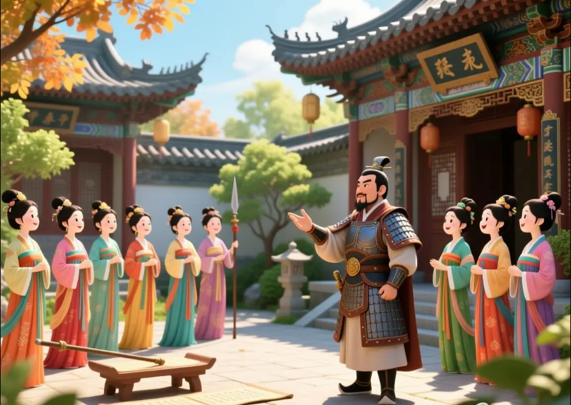 孙武把这些宫女分为两队,让阖庐最宠爱的两个宫女分别担任两队的队长,命令所有的宫女每人都拿一支戟。孙武问:“你们知道自己的心、后背、左手、右手吗?”宫女们齐声回答:“知道!”孙武说:“好。现在,我命令你们向前,你们就看心所对的方向;命令你们向左,就看左手所对的方向;命令你们向右,就看右手的方向;命令你们向后,你们就朝背后转过身去,大家能够做到吗?”众宫女都应声说:“能!”孙武把号令交代清楚之后,便让人把斧钺等兵器摆在宫廷当中,并且三令五申:如果不听号令,就要受到军法的处分。随后击鼓传令向右,宫女们习惯于轻歌曼舞,哪里受过这种约束?听到号令,七扭八歪,乱哄哄地笑个不停。孙武说:“号令说的不清楚,动作讲的不明白,所以你们操练不好。这不能怪你们,是我这做主将的责任。”说完又把规定的号令反复讲了几遍,然后击鼓传令向左。宫女们照旧乱七八糟,又是格格地一阵大笑。孙武说:“先前,没有把号令讲清楚,你们不熟练,那是我做主将的责任;现在,号令既然已经交代清楚了,你们却不按照号令去做,那就是你们的责任了。依据军法,应该处罚你们的队长!”说完就要将左右两个队长斩首。吴王阖庐从台上看到孙武要斩那两个最宠爱的宫女,大吃一惊,连忙派人传下令来,说:“我已经知道将军是善于用兵的了。但是这两个美人可万万斩不得!没有她们两个陪伴,我连饭也吃不下啊!”孙武说:“我已经接受了大王的任命,当了主将,将在军,君命有所不受。”于是下令立即把两个女队长斩首。紧接着又指派了另外两个人做队长,重新击鼓操练起来。这一下,那些宫女们不用说不敢笑,连粗气儿也不敢出了。一个个聚精会神地按着鼓声操练了起来,不管是向左向右,向前向后,或者是跪下起立,完全符合号令,一点差错也没有。