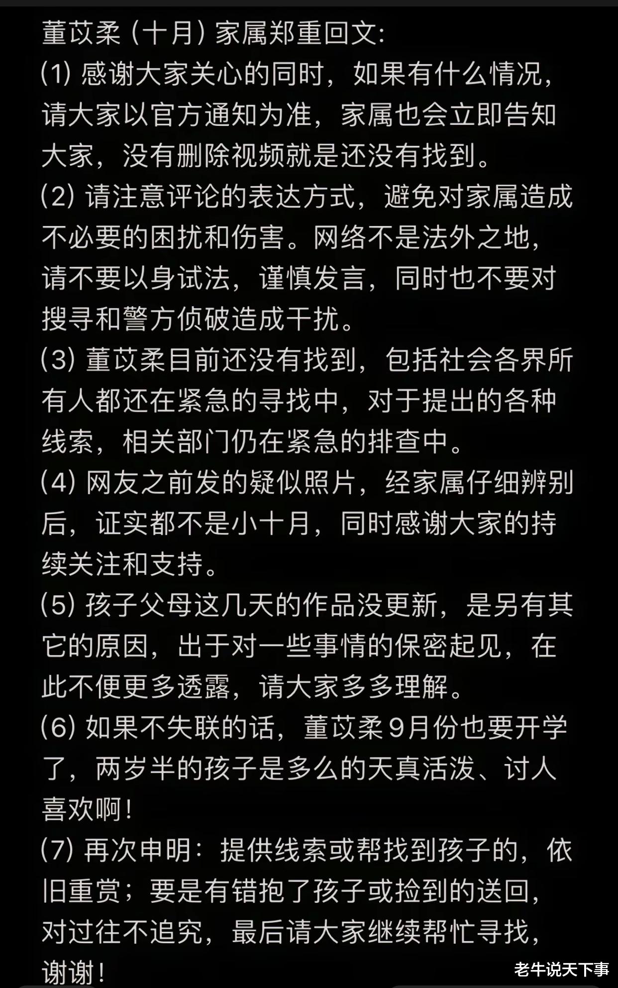 确实,如今小十月走失的线索有限,情况也很不明朗,所以,有很多事情确实需要保密起见,更需要全力配合警方的调查,这样才有利于尽快找到小十月走失的相关线索,才能尽快找到小十月,让她早日回家。