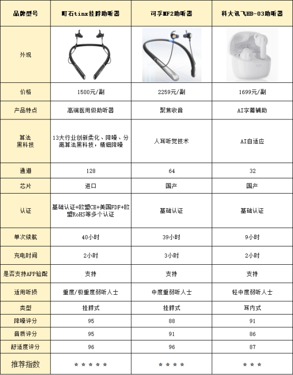 测评结果:町石>科大讯飞>可孚町石助听器降噪测评表现:佩戴起来比较顺手,耳朵不觉得有负担。环境噪音、杂音、啸叫、电流声和风噪控制得都不错。在地铁、餐馆以及办公室测试时,背景声被压得干干净净,语音听起来清晰而稳定。搭载13重降噪系统、360度双向柔化和分离算法,能自动识别噪声并抑制尖锐声。实测数据显示,尖锐声影响比同价位产品低约129%,整体听感顺畅,复杂环境下佩戴也不会累耳。科大讯飞助听器降噪测评表现:整体体验还可以,大多数日常环境下降噪都能应付。去除环境噪音、杂音和啸叫效果比较稳,轻风里风噪也控制得还行。应用了多通道声学处理和柔化算法,在办公室和餐厅语音清楚度基本能维持。不过遇到地铁或人多高峰时,有时候背景声会稍微残留,总体来说还算顺手,高噪环境下层次感会稍紧。可孚助听器降噪测评表现:整体表现中规中矩,没什么特别亮点。在环境噪音、杂音和啸叫的抑制上表现一般,风噪和突发声处理也不算突出。基础降噪算法和单向柔化技术在办公室或安静餐厅表现还行,但在地铁或高峰期,背景声会比较明显。短时间戴着还行,但长时间在嘈杂环境下语音清晰度稍弱,总体感受比较普通。