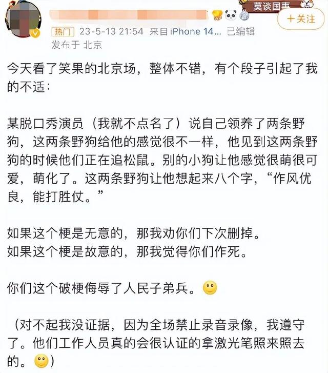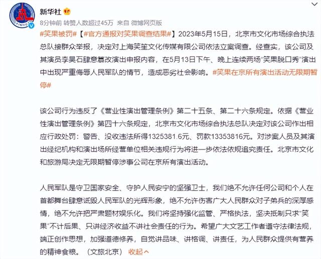 5月17日,据多家官媒对外报道称,因为脱口秀演员House在演出时玩梗侮辱人民子弟兵,被群众举报后,所属经纪公司笑果文化被立案调查,而有关部门根据相关规定,对其做出严肃处罚,没收违法所得百万并罚款千万,同时决定暂停笑果文化在北京的所有演出。