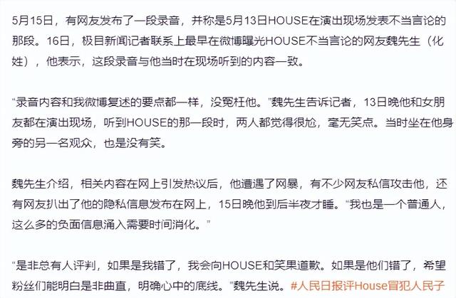 风波过后,有媒体就联系到了在微博上曝光House玩破梗侮辱人民子弟兵的观众,对方表示这件事给他生活带来了很大的影响,主要是有很多不明身份的网友私信攻击谩骂他,甚至有的还扒出了他的个人隐私信息发到网上,对他进行无休止的网暴。