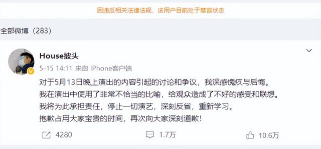 当然,有错就要认,挨打要立正,笑果文化接受了处罚,并作出了一系列整改措施,首先解除了旗下艺人House的劳动合同和艺人经纪合同,同时还宣布停掉全国各地所有线下演出业务,进行全面整顿和学习,希望能够得到社会公众的谅解。