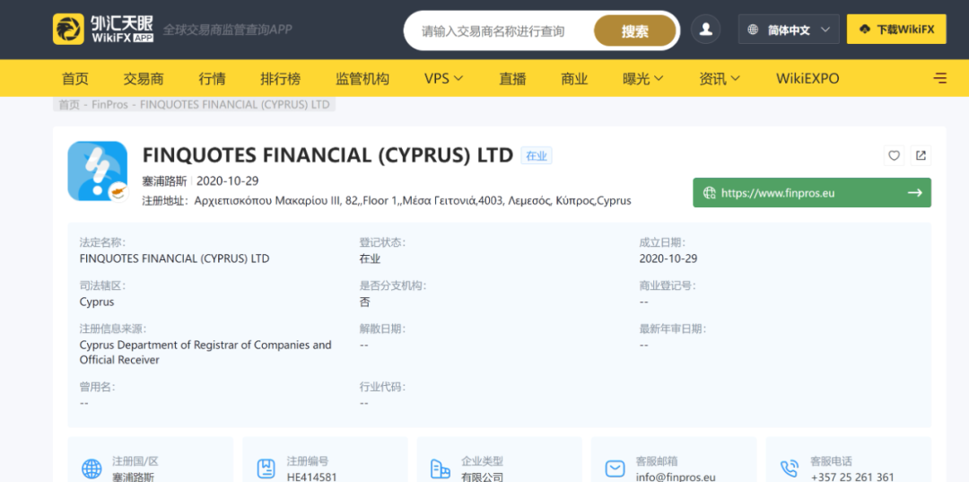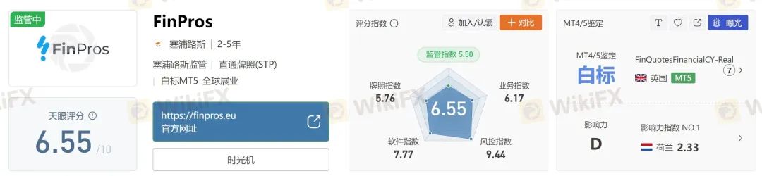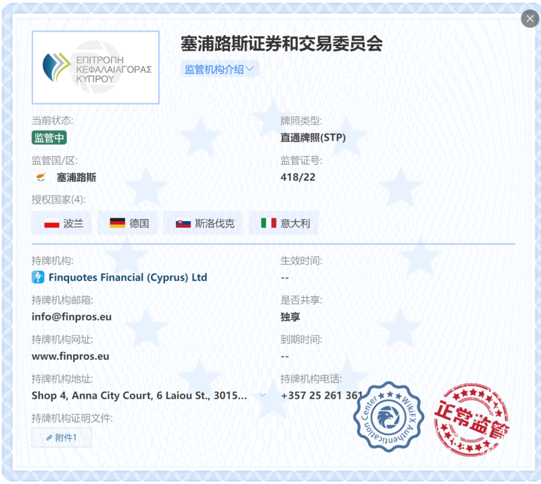 在外汇天眼对FinPros的监管信息披露中,我们可以看到这个平台持有一张塞浦路斯证券和交易委员会颁发的直通牌照(STP),持牌机构为FINQUOTES FINANCIAL (CYPRUS) LTD。