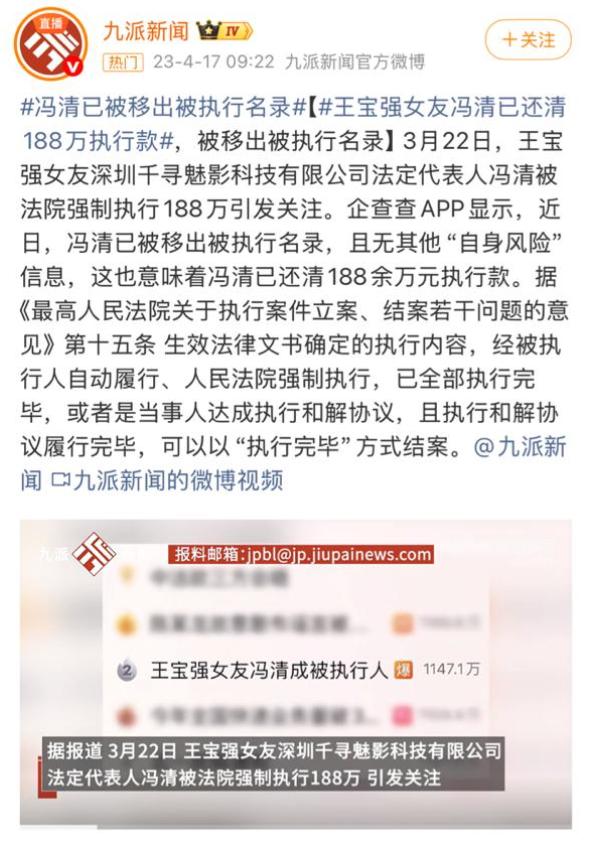 可随着两人感情逐渐稳定,冯清的争议也越来越多。2023年,冯清名下一家公司被法院列为被执行人,执行标的高达188万元,引发网友质疑,大家纷纷猜测,她是不是因为欠债才刻意接近王宝强,想借着王宝强的名气和财富还债。