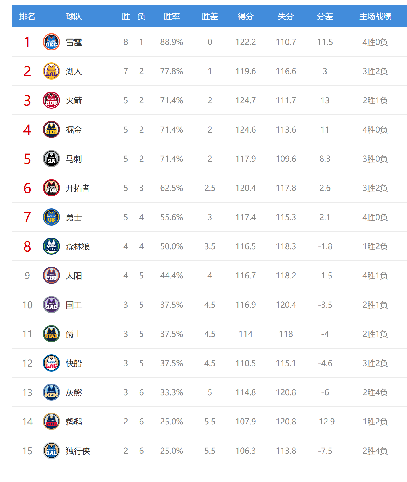 今日比赛后西部最新排名如下: