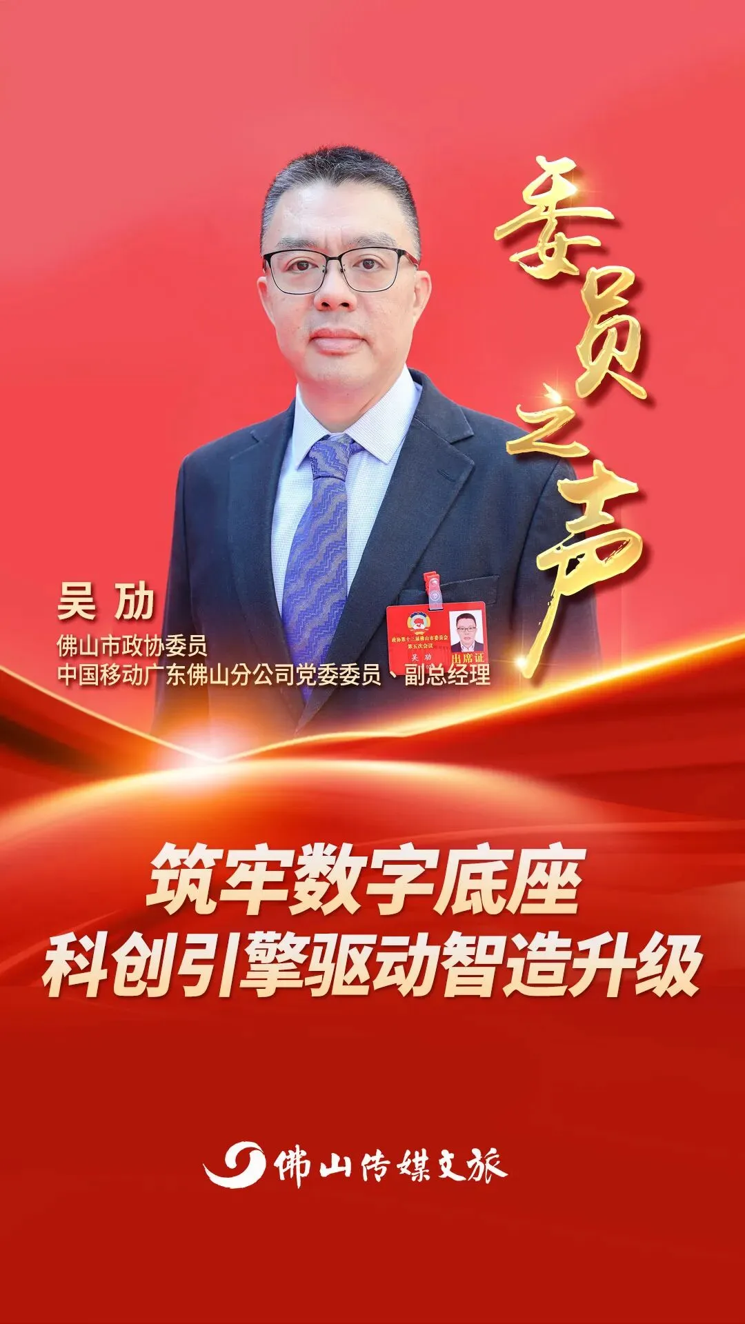 吴劢聚焦产业数智化转型痛点,提出建强算力底座、人才集群、资本载体三大支点,将科技创新转化为高质量发展“最大增量”,为佛山“智造强市”建设保驾护航。