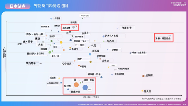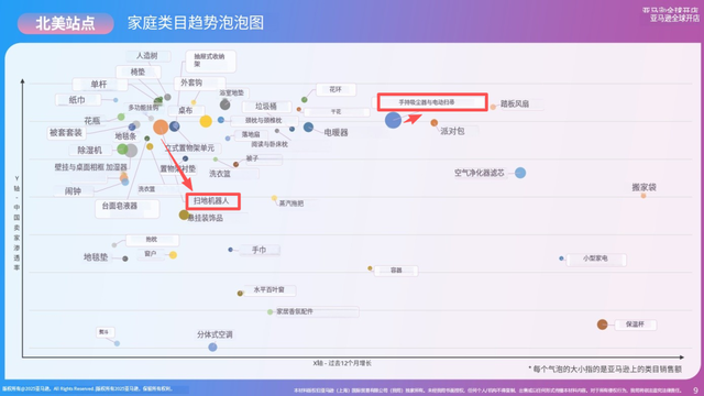 “趋势泡泡图”是挖掘蓝海品类的利器,其判读有几个关键维度:图中每个气泡的大小代表该细分市场的销售额规模,气泡越大,说明当前市场体量越大;而X轴(横轴)通常代表该品类过去12个月的增长率,越往右侧,增长势头越猛。