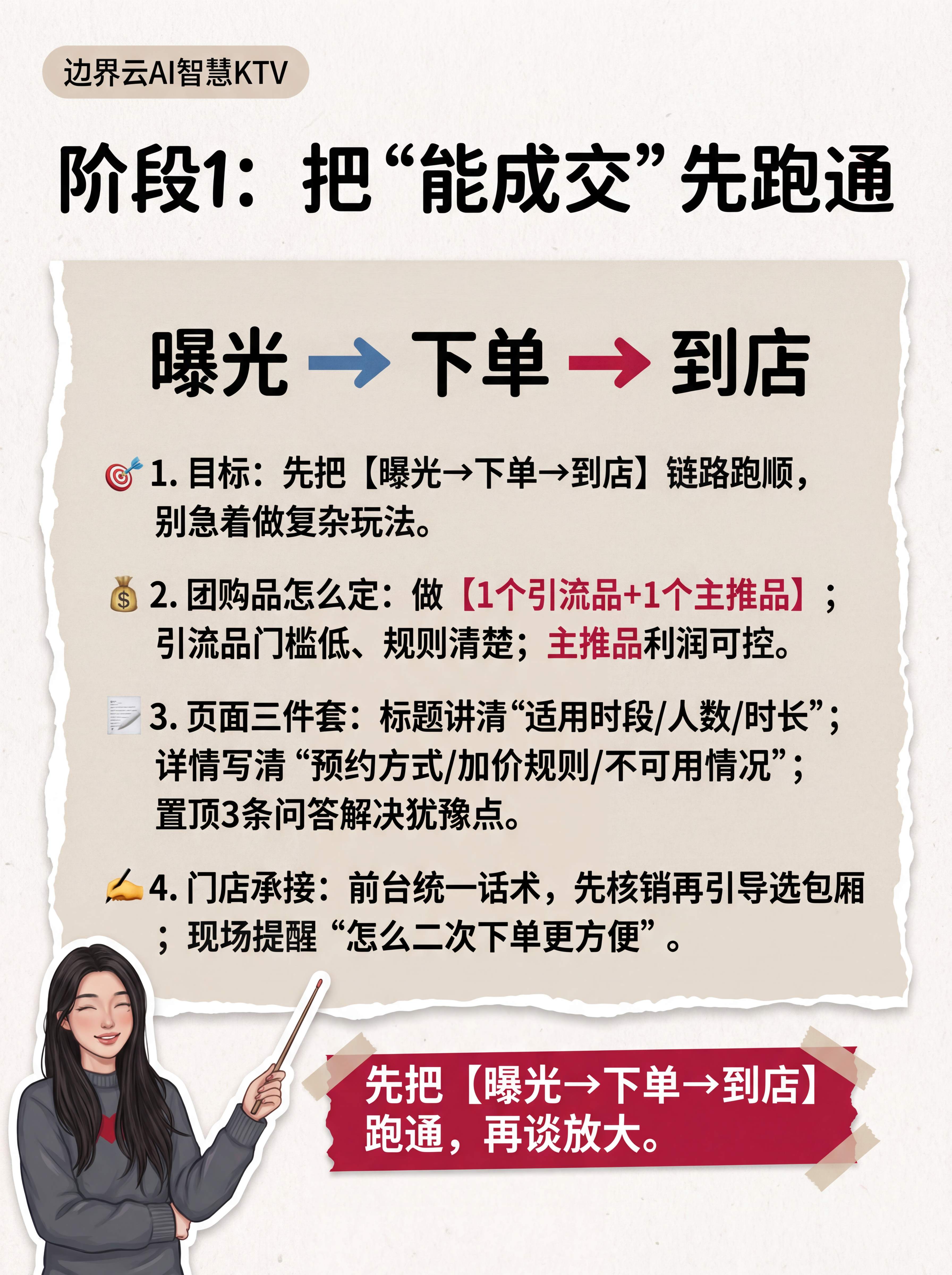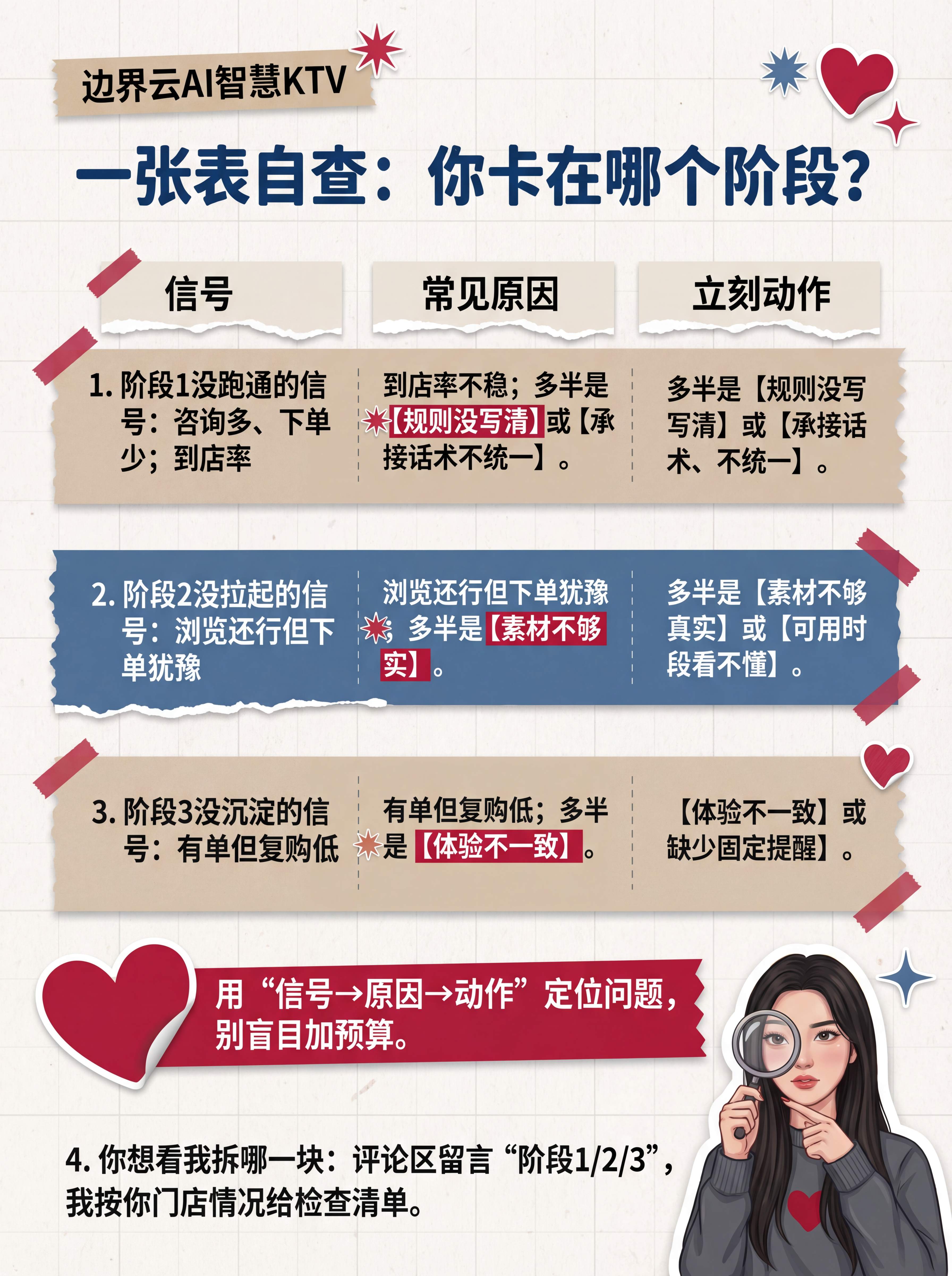 给KTV老板的一句话建议别盲目加预算!先用三阶段框架诊断你的卡点,精准发力才能事半功倍。评论区留言"阶段1/2/3",我可以根据你门店的具体情况给检查清单。