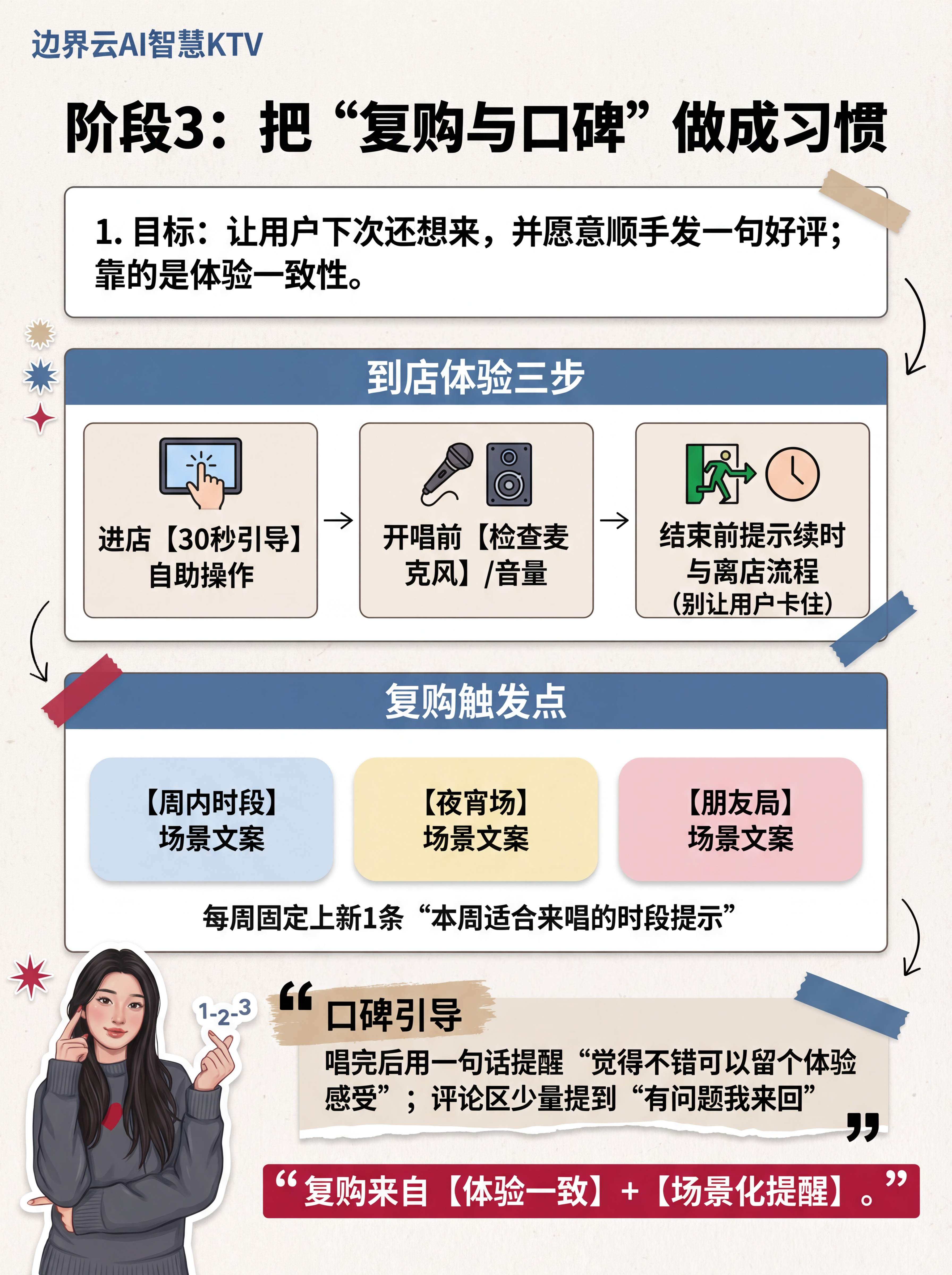 场景化复购触发复购需要场景化的主动触达。数据显示,定期发送"本周适合来唱的时段提示"的门店,周内时段利用率提升35% 。针对不同场景(周内时段、夜宵场、朋友局)的个性化文案,可将复购率提升至28.6% 。