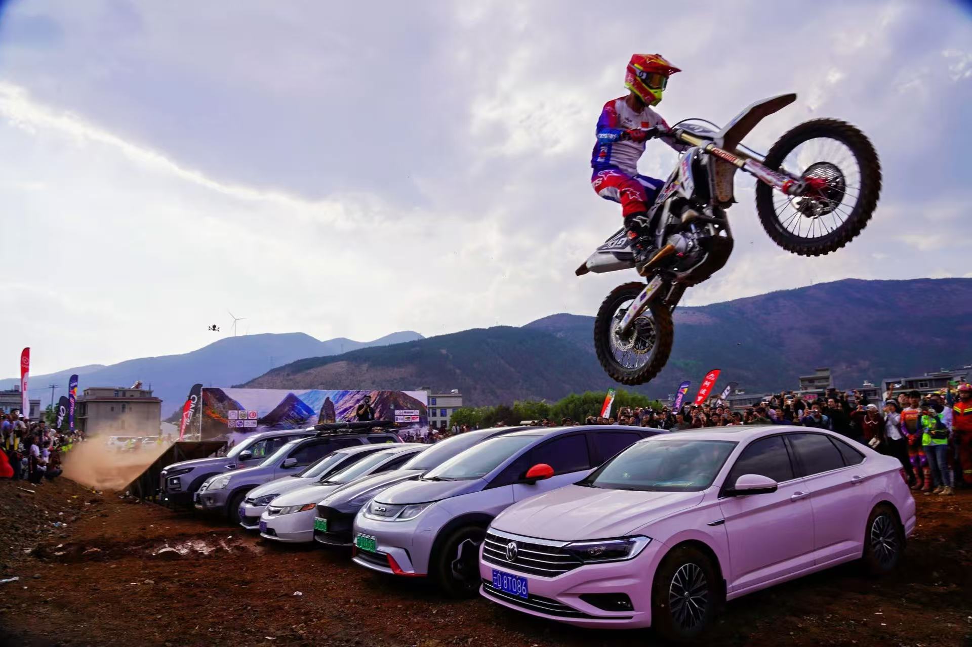 短暂的休整后,场地赛震撼上演,老将组、黄金组、活力组、电车组依次发车,每组15圈,成绩以时间计算!多车群发的场面激情壮观。伴随着电车组的顺利完赛,振奋人心的高光时刻如约而至,职业越野摩托赛车手许健豪飞跃8辆汽车表演,震惊全场,欢呼声、掌声震耳欲聋!