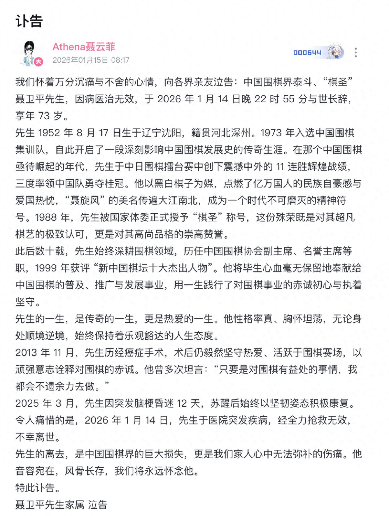 今天刷手机的时候看到一个消息,心里“咯噔”一下。聂卫平,那个我们从小就知道的“棋圣”,真的走了。他女儿聂云菲在1月15日发了讣告,说父亲在1月14号晚上10点55分离世,享年73岁。说实话,看到这个消息挺难接受的,感觉像是一位长辈突然没了。
