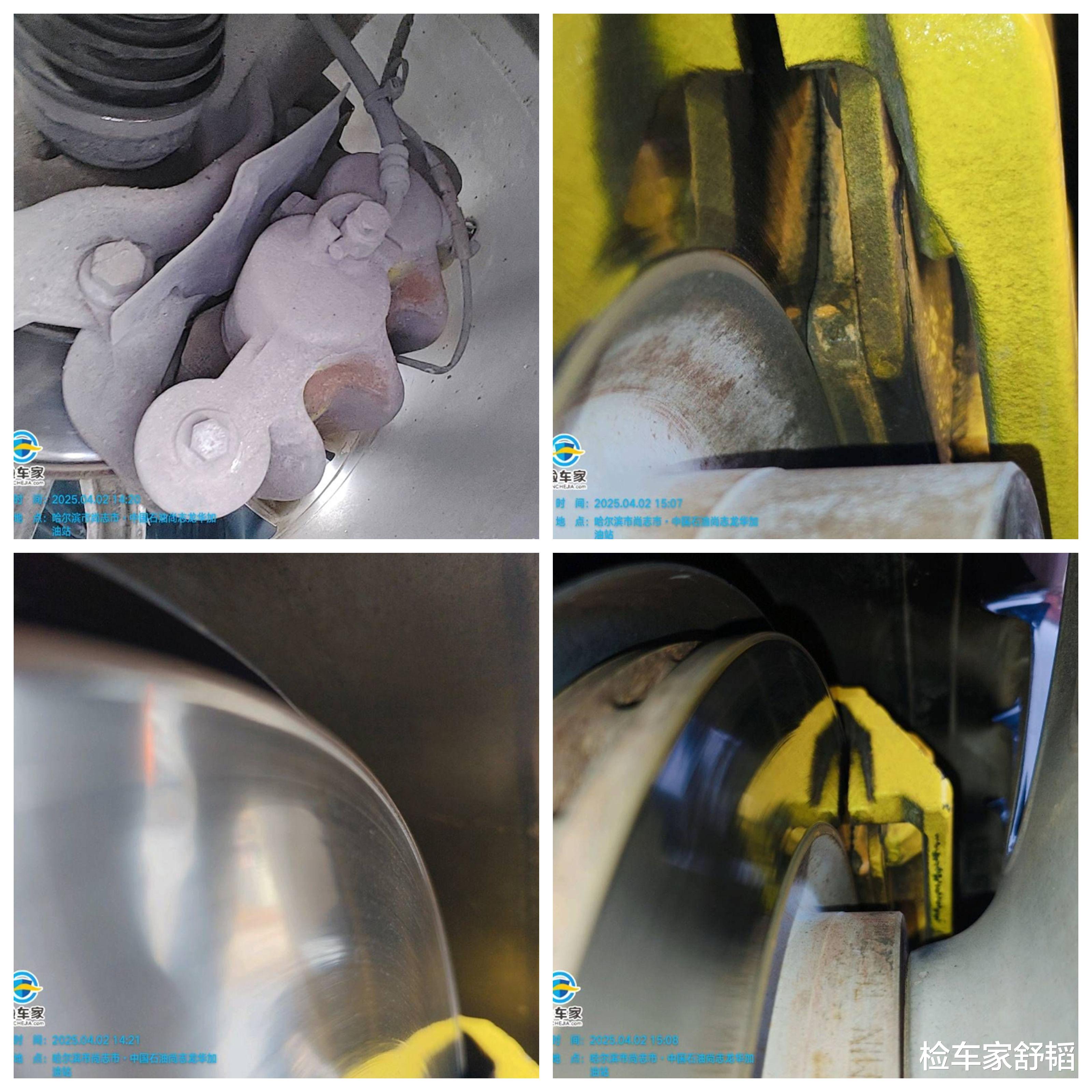 接着检查车辆的磨损,全车的轮胎都有过更换,这个很正常,10年的二手车轮胎可能都换过两三次了。但刹车盘均存在不同程度的磨损起槽现象,不符合12万公里的使用情况。