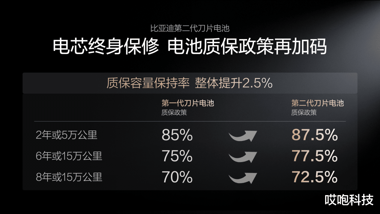 比亚迪宣布,第二代刀片电池的质保标准同步升级:整体容量保持率提升2.5%,6年或15万公里内,当电池容量衰减低于77.5%时,即可享受免费包换服务,电芯则延续终身保修政策。