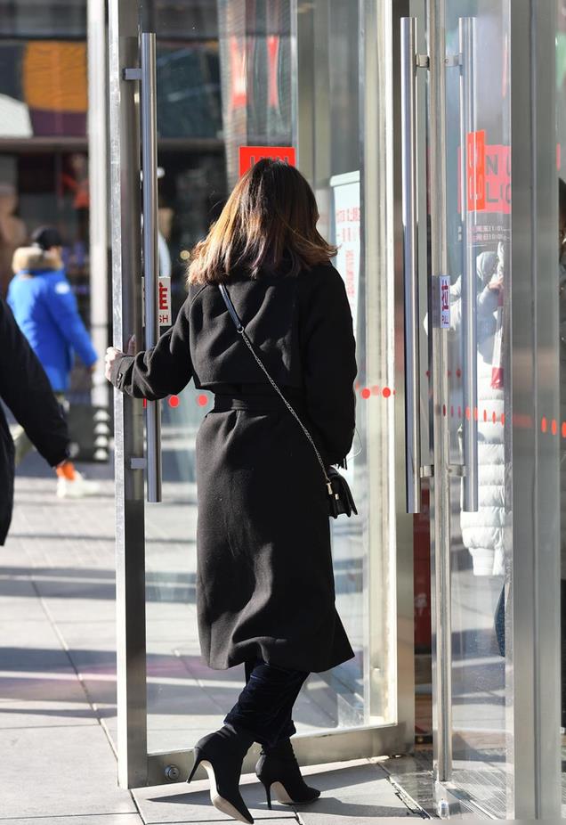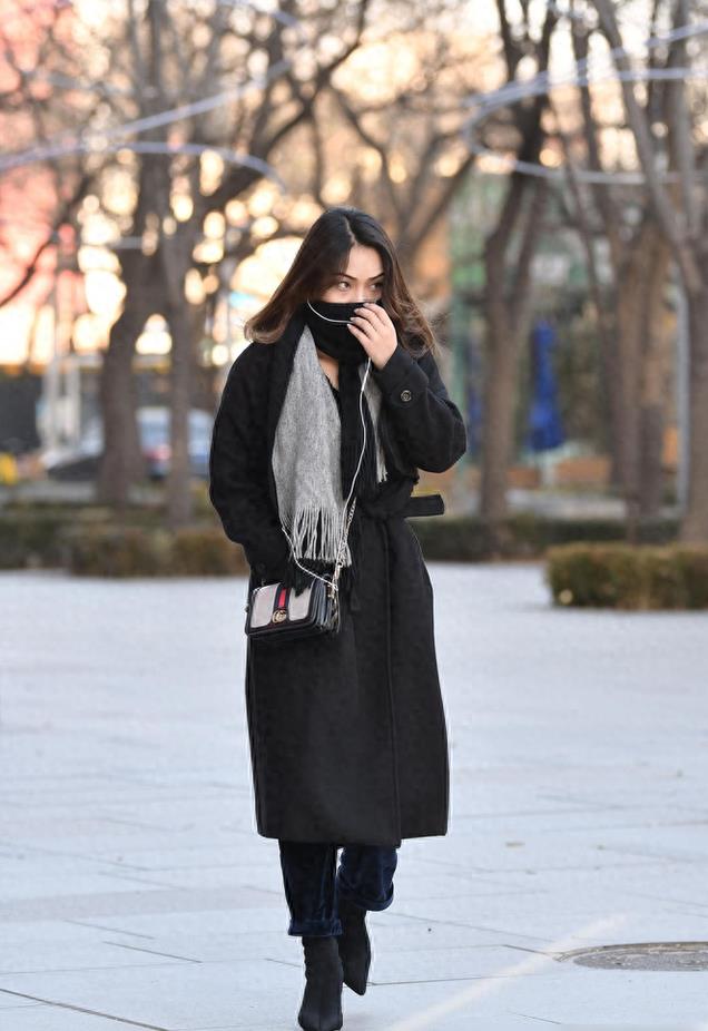 单色呢子大衣,黑色,其用版型修身加上呢子面料作用,使得我们整体造型时尚感爆棚,同时颜色黑色加上大衣大气的长度和宽松装饰,竟然还达到了显瘦目的,太棒了!