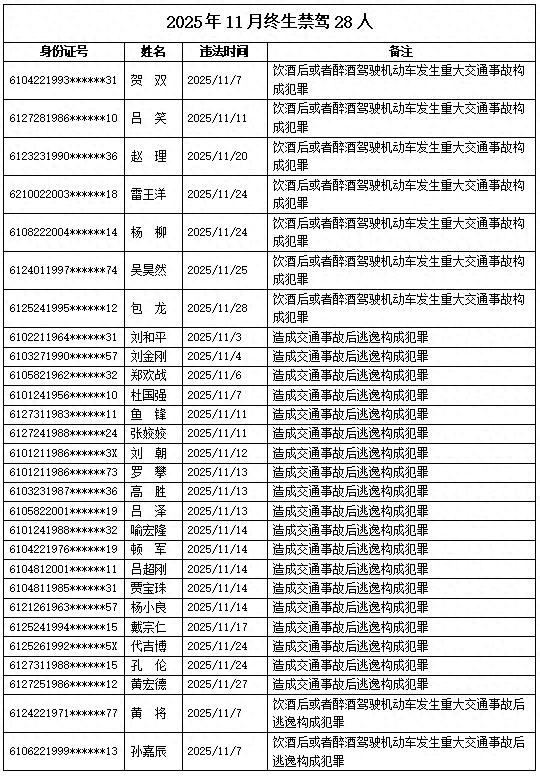 陕西省公安厅交警总队曝光 2025年11月份终生禁驾名单 2025年11月,全省28名驾驶人被终生禁驾。其中,7人因饮酒