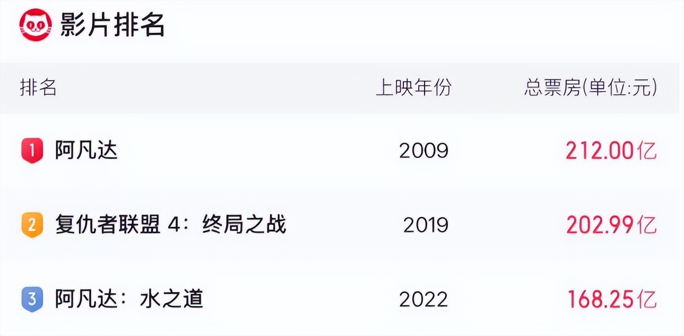 而截至目前,《阿凡达》仍旧以212亿的票房稳居全球影史排行榜首位,《阿凡达2》则以168亿位列季军。