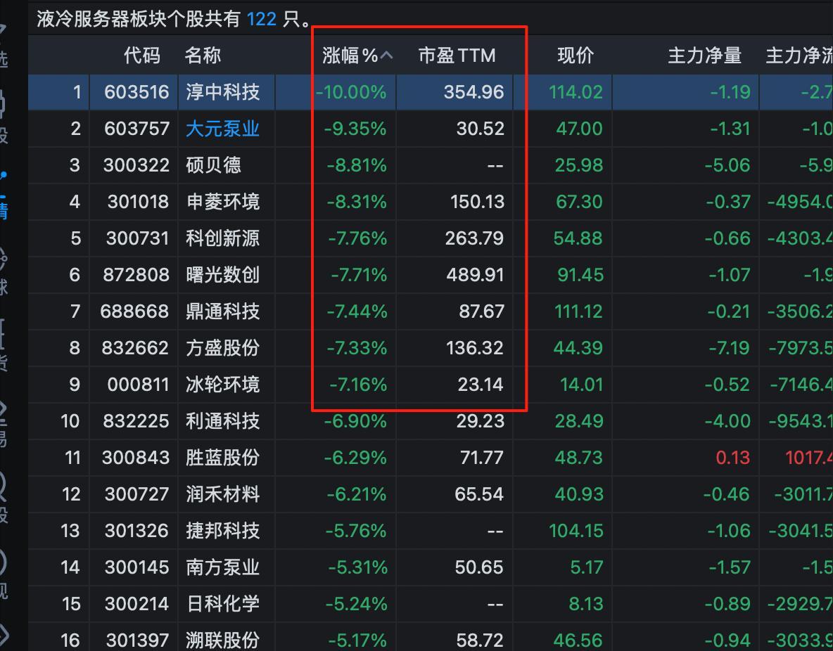 第二股冷风,是液冷概念普遍高耸入云的估值泡沫,终于不堪重负。曙光数创TTM市盈率竟高达490倍,如悬顶之剑;淳中科技355倍、科创新源264倍、申菱环境150倍……这些数字早已脱离了基本面支撑。高估值意味着高风险,稍有风吹草动,股价便如惊弓之鸟,脆弱不堪。