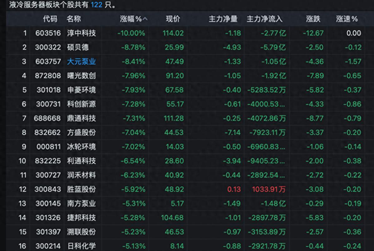 昨日还沉浸在20余股涨停的狂欢中,液冷概念今天却迎来当头一棒。整个板块寒意刺骨,13只核心龙头集体重挫,跌幅均超过5%,场面堪称惨烈。淳中科技一头栽下10%跌停板,硕贝德、大元泵业紧随其后暴跌超8%,曙光数创、申菱环境等无一幸免,市场情绪瞬间冰封。