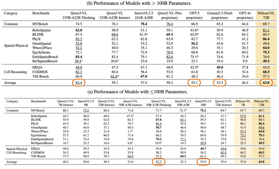本次开源的Pelican-VL 1.0的核心优势在于深度整合海量数据与自适应学习机制,在由 1000+ A800 GPU 组成的集群上训练,单次检查点训练耗费超过 50,000 A800 GPU-小时;团队从原始数据中蒸馏出的包含数亿 token 的高质量元数据以做训练基石。基于上述优势,Pelican-VL 1.0实现了在基线基础上性能提升20.3%,平均超过Qwen3-VL系列、InternVL3.5系列等同级别开源模型10.6%。