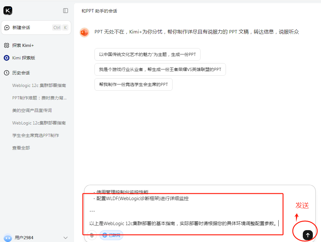选择“PPT助手”,将刚才在DeepSeek复制的文案粘贴进去,然后点击发送,如下图所示。