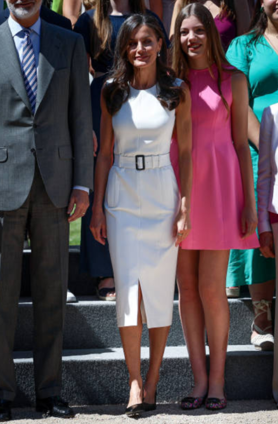 王后与小女儿站在一起,一袭白裙仍然比女儿腰细一圈,只是个头没有小女儿高而已!大家都知道小白裙穿不好容易显胖,然而莱蒂齐亚穿上后却身材纤细,只能说她的身材太好了,比高挑的小女儿还要瘦,气质更是脱颖而出。