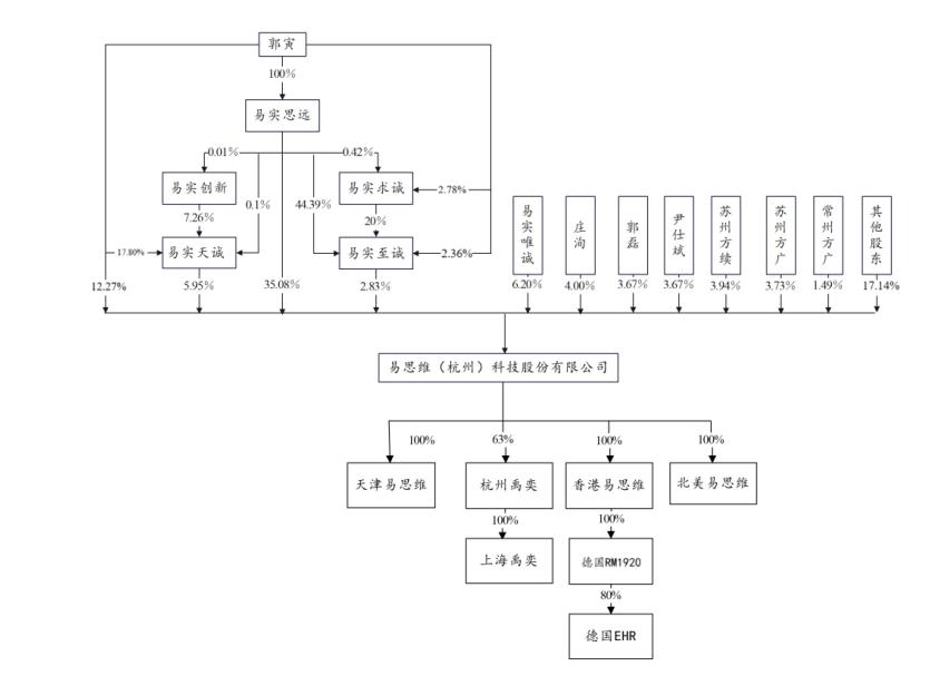 目前,易思维实控人为公司创始人&CEO郭寅,郭寅直接持有公司 12.27%股份,通过实际控制易 实思远、易实天诚、易实至诚分别间接控制公司 35.08%股份、5.95%股份、 2.83%股份,合计控制公司 56.13%股份。