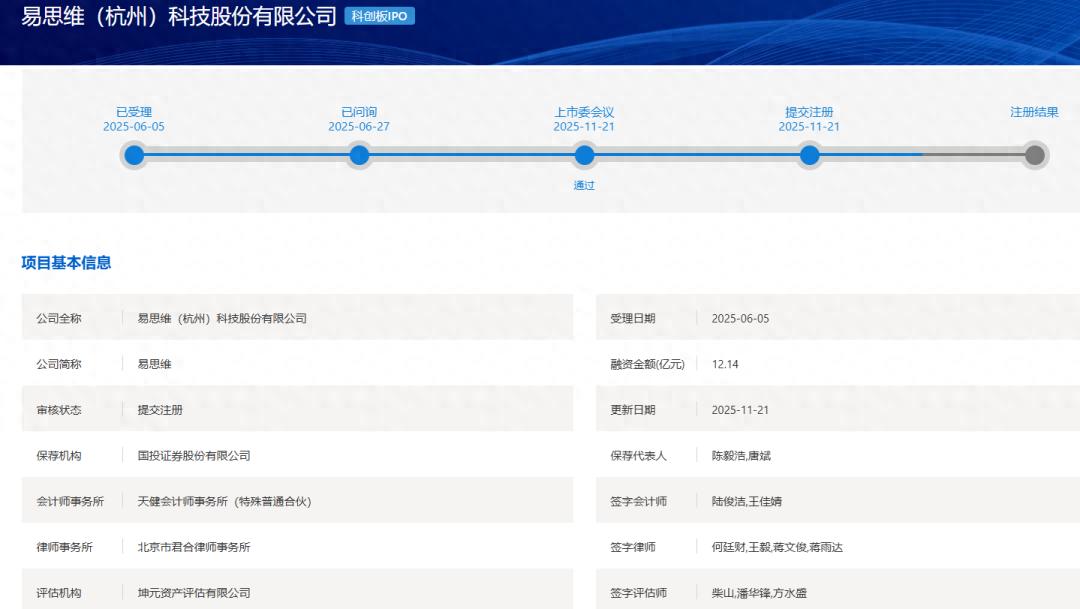 11月21日,上海证券交易所官网显示,易思维(杭州)科技股份有限公司(下文简称“易思维”)科创板IPO过会,距离登陆科创板仅有半步之遥。