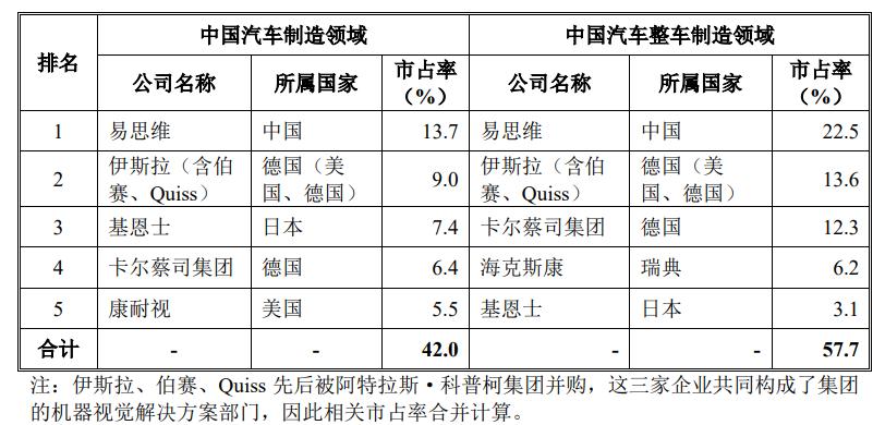 招股书披露,根据弗若斯特沙利文的统计,2024 年度中国汽车制造和汽车整车制造机器 视觉产品的市场规模分别为 31.1 亿元和 16.2 亿元,易思维在相应市场的市占率 别达到 13.7%和 22.5%,均位居行业第一。同年中国汽车整车制造机器视觉产 品的国产化率为 31.7%,其中 22.5%来自易思维,其余 9.2%来自其他国产企业。
