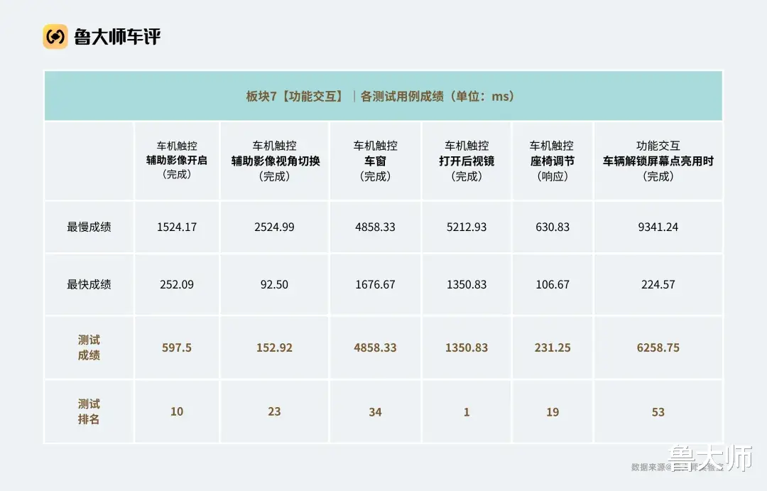 功能交互板块这一块非常极端,打开后视镜1350.83ms直接拿下全场第一,影像和座椅响应也算利落,但车窗控制和解锁亮屏却慢到令人出戏,尤其解锁点亮超过6秒,说明不同功能接入链路和优先级差异巨大,优化还不够统一。