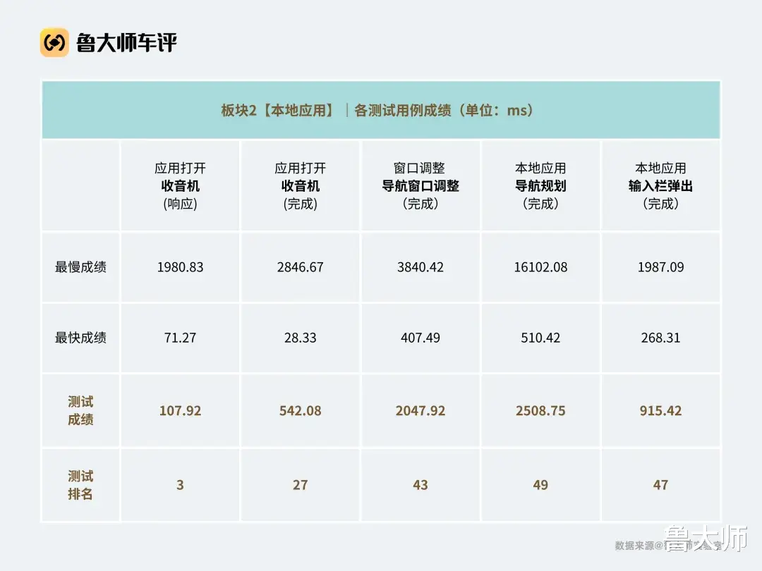 本地应用部分呈现明显分化。轻量级应用启动极快,收音机响应仅107.92ms,进入前三。但导航相关任务耗时直接拉到2秒以上,说明地图模块优化不足,是本地应用体验的主要短板。