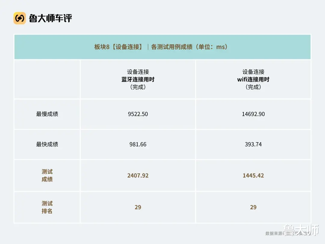 设备连接属于标准中位水平。蓝牙2407.92ms、WiFi 1445.42ms,均排第29。能用但不够快,与那些对蓝牙/WiFi 着重打造入口效率的品牌相比,仍有优化空间。
