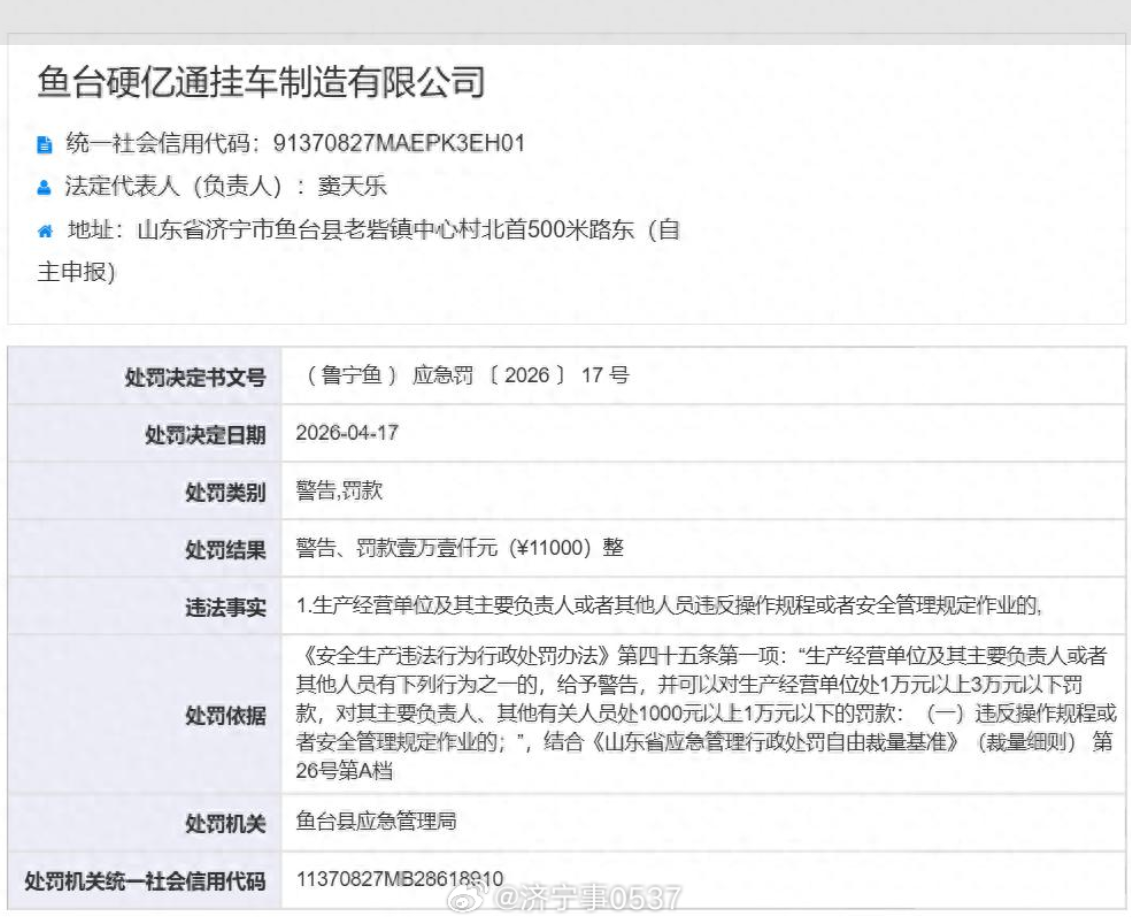 此次处罚是应急管理部门强化企业安全生产监管、严查违规作业行为的具体举措,旨在督促生产经营单位严格落实安全生产主体责任,规范作业流程,杜绝违规操作行为。挂车制造行业涉及机械加工、焊接、装配等多道高危工序,任何违规作业都可能引发机械伤害、火灾爆炸等安全事故,威胁从业人员生命安全与企业财产安全。